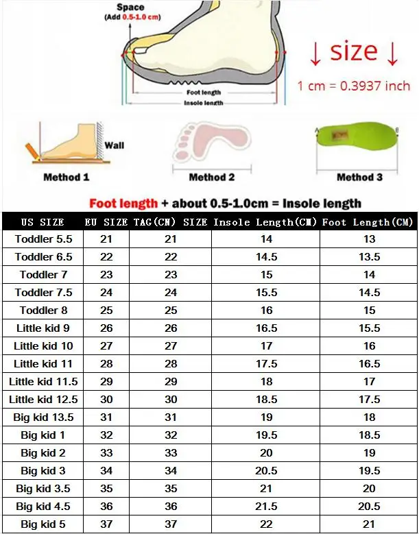 3:The way to choose perfect shoes for your children.Foot length+1cm=insole length. Such as kid's foot length as below.IF her/his foot length is 20cm,you can add 1cm.That's to say,choose insole length 21cm.Thank you for your support.